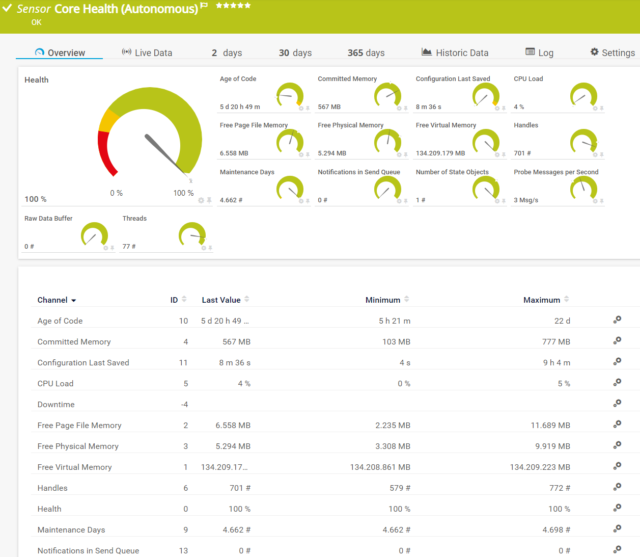 The Core Health (Autonomous) sensor is a probe-independent sensor that monitors internal PRTG parameters. It shows the status of the PRTG core server and checks various parameters of the PRTG core server that have an impact on the stability of the system.