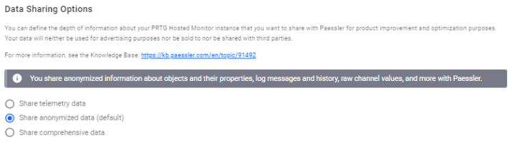 To define the depth of information that you want to share with Paessler for product improvement and optimization purposes, you can choose among the given options.