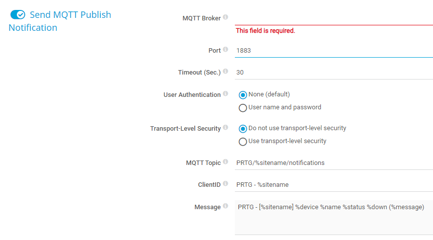 Enter the topic for the MQTT publish notifications. The default topic is PRTG/%sitename/notifications.