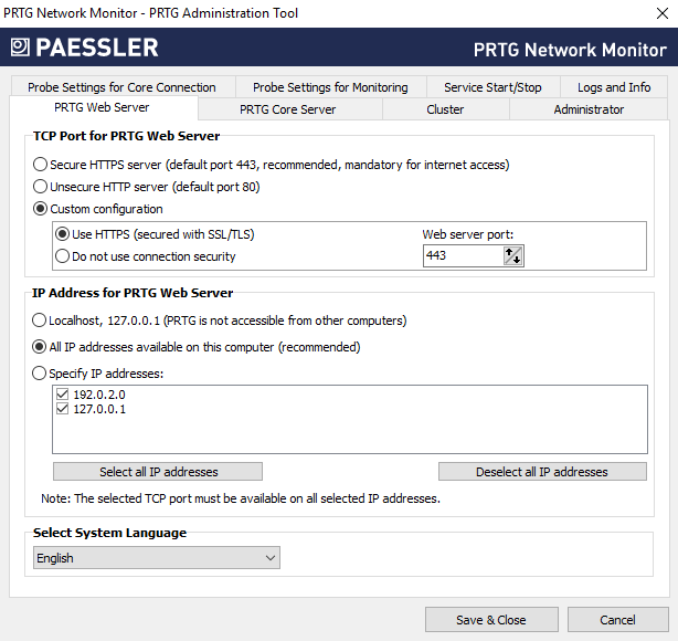 Edit IP addresses, ports, access methods, and language for the PRTG web interface.