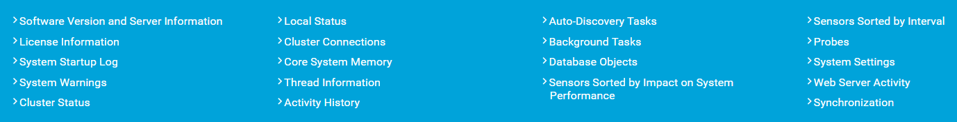 i_round_blueYou might need this data for debugging or when you contact the Paessler support team. They ask you in some cases to provide system status information to analyze any issues with PRTG.